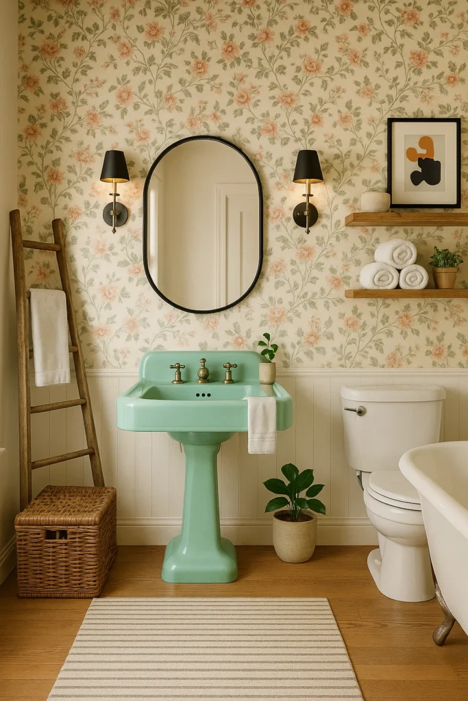 If you’ve inherited something like this, don’t rush to replace it—try using what’s already there to build a one-of-a-kind farmhouse bathroom decor idea that blends the old and the new, the floral and the sleek, the muted and the bold. Sometimes, the quirkiest features are the ones that make your space feel truly yours.
