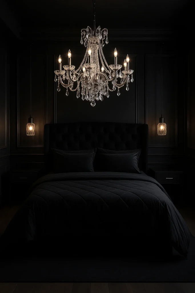 For those exploring Moody Black Bedroom Ideas, nothing feels more luxury than a statement chandelier that becomes the centerpiece of a moody black bedroom. A crystal fixture brings in a soft sparkle, while a modern pendant light adds a warm glow and visual depth. The reflection from the chandelier dances on the dark walls, creating an air of quiet elegance that feels both timeless and rich in character.